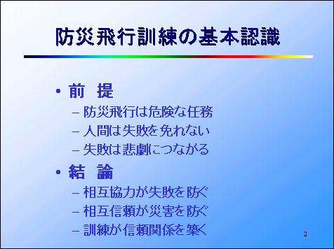 最初に防災飛行訓練を考えるための、基本的な認識もしくは前提条件を明確にしておきます。訓練の前提としては、防災飛行はヘリコプターの仕事の中では危険な任務であるということ。また人間は完璧ではなく、失敗を免れ得ないということ。しかも防災飛行において失敗すれば、その結果は恐ろしい悲劇を招くということです。
