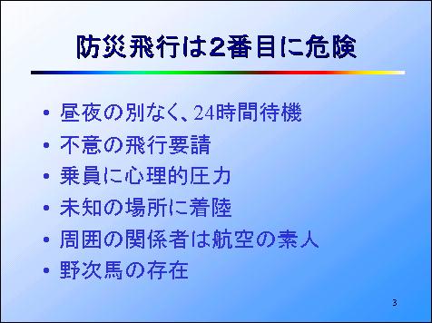 前のスライドで、ヘリコプターの防災飛行は危険と言いました。どのくらい危険かというと、ここにあるように、ヘリコプターの業務としては2番目に危険です。1番目はいうまでもなく戦争です。