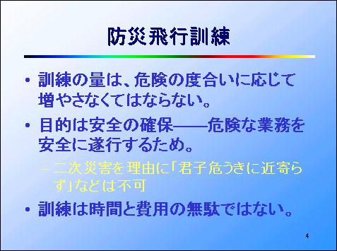 そこで、危険な防災飛行にそなえる訓練は、危険の度合いに応じて、その量も多く増やさなくてはなりません。訓練の目的は安全の確保です。危険な業務を安全に遂行するためです。危ないからといって「君子危うきに近寄らず」などと、危険を避けていては防災活動はできません。