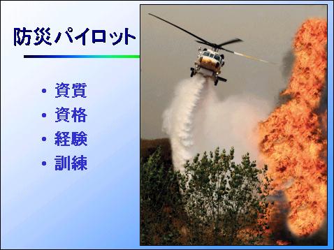 防災任務の遂行に当たって、その第一線に立つのはヘリコプター・パイロットです。したがってパイロットは資質、資格、経験を充分に勘案して選定さるべきであり、なおかつ不断の訓練を欠かすことができません。