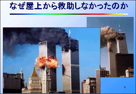 話は急に変わりますが、9.11テロに際して、ワールド・トレード・センターの屋上から何故ヘリコプターによる救出がおこなわれなかったのでしょうか。ハイジャックされた旅客機のぶつかったところから上の階の人は屋上へ逃げようとしました。上空にはヘリコプターが待っていました。しかし、ヘリコプターに助けられた人はいません。