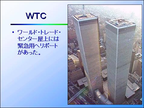 ワールド・トレード・センターの屋上には勿論、緊急用ヘリポートが設けてありました。実際に1993年、爆弾テロで大量の煙が発生したときはニューヨーク警察のベル412が着陸し、屋上へ逃げてきた28人を救出しました。同じことが、9.11では何故できなかったのでしょうか。