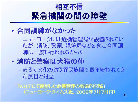このことをニューヨーク・タイムズ紙は2002年7月7日付けの紙面で「9.11テロで露呈した危機管理の致命的欠陥」という見出しで報じています。そこには第1に、合同訓練は一度もしたことがなかったと書かれています。