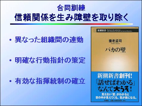 こうして、いくつもの機関が共同訓練を重ねて行けば、やがて相互の関係が滑らかに動くようになり、縦割りといわれているような状態を脱して、お互いの信頼関係が醸成され、円滑な共同作業ができるようになります。これは極めて重要なことであります。