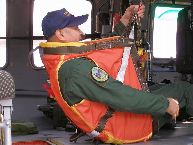救急救命士の資格をもつ小野寺航空士(機上救護員)の実演。(西川 渉、2012.1.15)