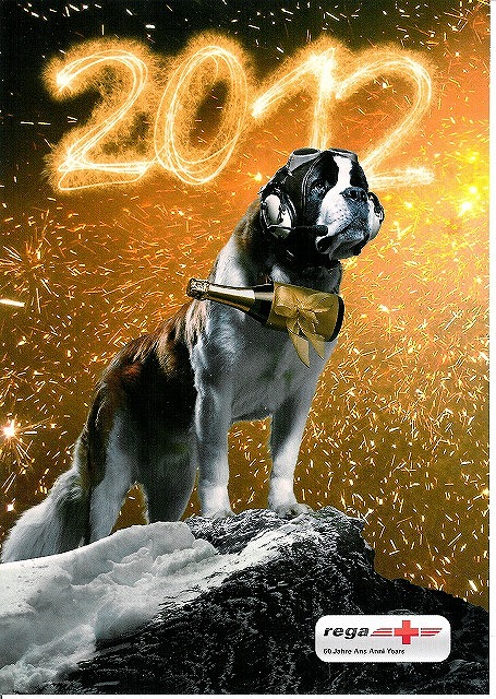 そうしたセント・バーナード犬の伝説とREGAのヘリコプター救助を結びつけた図柄で、しかもカードの中をめくるとドイツ語、フランス語、スペイン語、英語で「セント・バーナードが飛び方をおぼえるまでは、今年もREGAがベストを尽くします」と書いてある。