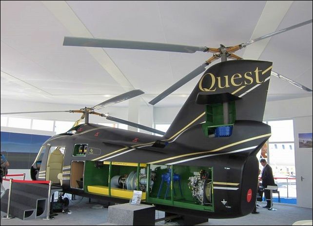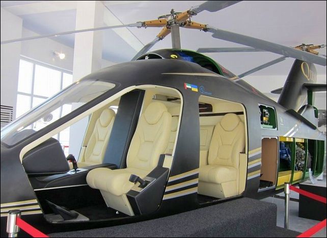 同機はウクライナとの共同開発で、背景には旧ソ連技術陣の協力があるらしい。機体形状は4枚ブレードのローターが前後についたタンデム・ローター形式。モックアップは4座席だが、ローターが前後についているので、胴体の延長は比較的容易という。