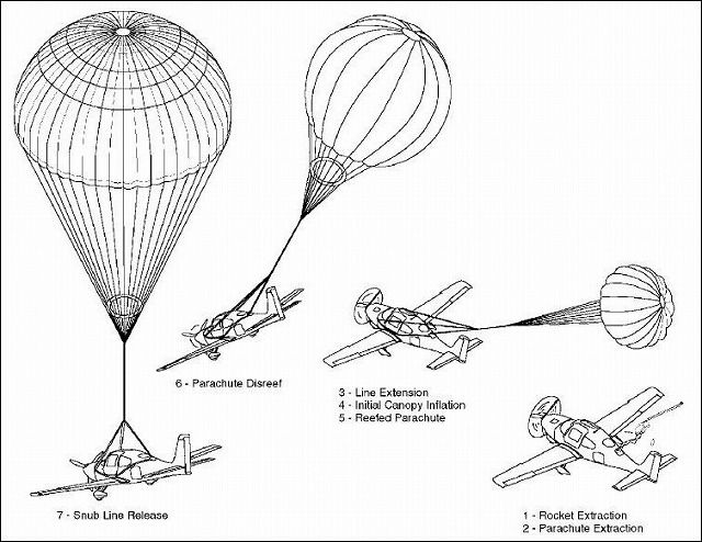 では、パラシュートはどのようにして開くのか。下の図に示すように、パイロットがハンドルを引くとロケットが飛び出す。ロケットは大直径のパラシュートを機体から引っ張り出し、機体の向きがどうなっていようと、たとえきりもみ状態であっても、また裏返しの背面姿勢であっても開くことができる。開き方はゆっくりしていて、機体は最終的に安定した水平姿勢を保つ。試験飛行の結果では、開傘から8秒くらいで前進速度がゼロになり、降下率は毎分500mくらいに落ち着く。